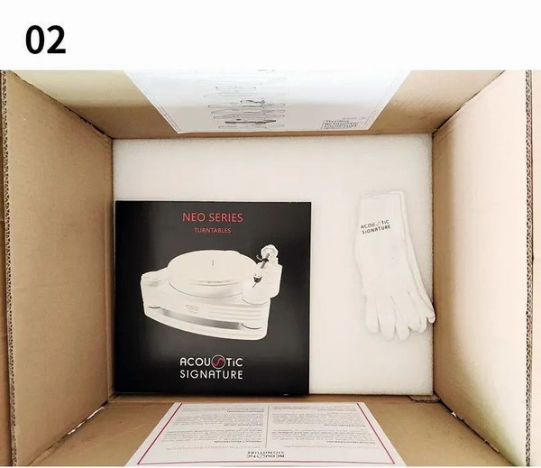 打開Maximus Neo開拓者唱盤的包裝,可見一對手套和一本紙封皮,內有說明書和唱片墊;