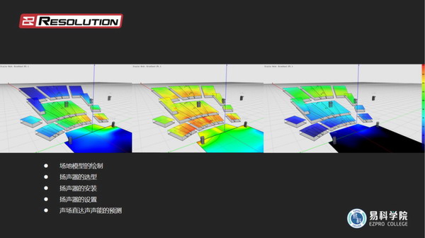 隨后,徐若克和易科國(guó)際市場(chǎng)營(yíng)銷中心高級(jí)總監(jiān)冀翔老師對(duì)于沉浸式擴(kuò)聲(后級(jí))系統(tǒng)設(shè)計(jì)進(jìn)行了詳細(xì)的講解,并通過EAW Resotluion聲場(chǎng)預(yù)測(cè)軟件進(jìn)行了分析和演示。